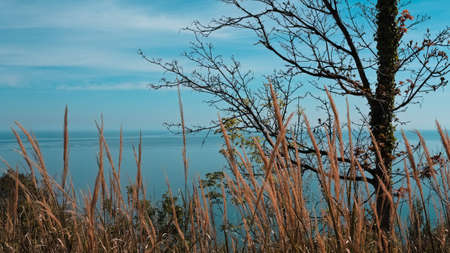Panoramic view of the Mediterranean Sea from a field with trees, plants and ears of wheat
