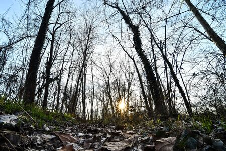 Bright sun shining through green tree leaves on peaceful day in amazing mystic forest