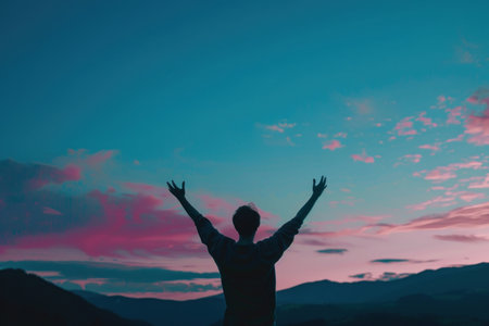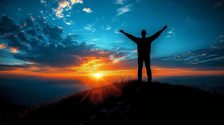 A person stands with arms outstretched, silhouetted against a vibrant sunset. The image showcases a warm color palette with hues of orange, yellow, and blue. The composition emphasizes a sense of openness and vastness, potentially suitable for themes related to achievement or aspiration. It can be used for various editorial and commercial purposes.