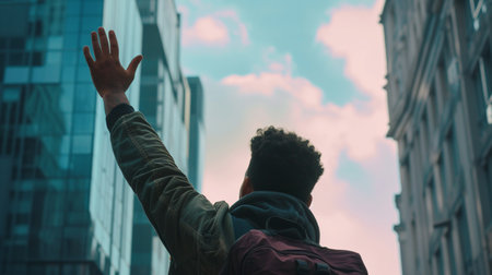 person raising hand back view