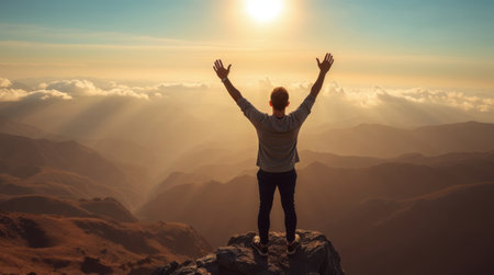 A man is standing on a mountain top, looking up at the sun. Concept of freedom and joy, as the man is embracing the beauty of nature and the warmth of the sun. The scene is peaceful and serene