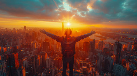A man stands on a rooftop with arms raised in triumph, celebrating success as the sun sets over a city skyline.