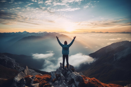 At dawn, a hiker stands triumphantly on a mountain summit, arms raised in celebration. The vibrant sunrise casts golden hues over the landscape, illuminating the stunning views.