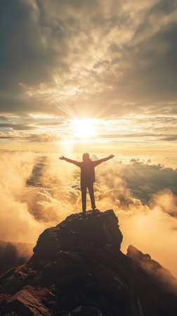 A figure stands on a mountain peak with arms open, celebrating a breakthrough moment as sunlight floods the landscape during sunset.