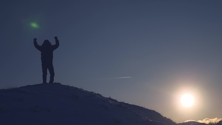 climber climbs snowy mountain, slides down and rises again in rays of bright sun. The tourist rejoices in his success, raises his hands up and happy jumping.