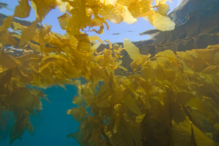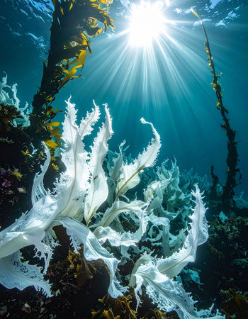 Experience a captivating underwater forest, where sunlight streams through vibrant kelp plants, creating tranquil patterns and a serene ambiance in the ocean.