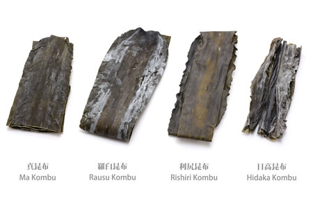 4 types of Kombu (dried kelp) from Hokkaido in Japan.Kombu is an essential ingredient for making dashi (Japanese traditional soup stock).