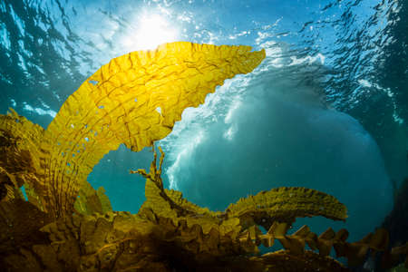 bull kelp growing on the rocks wave and swell in the ocean in tasmania australia