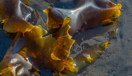 Shiny wet seaweed leaves on a sand. Close up.