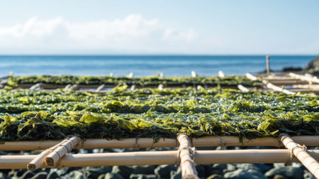 Fresh Wakame seaweed drying in the sun on a beach, spread across bamboo racks, with the ocean visible in the background.