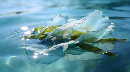 Ethereal digital artwork employing fluid layering techniques and subtle gradient glows to convey dreamy aquatic serenity and depth through precise transparency effects and cool tonal shifts. Perfect for sustainable fashion portfolios, eco-material showcases, marine biology visuals, underwater branding elements, and abstract graphics in web interfaces or print collate... AI-generated illustration.
