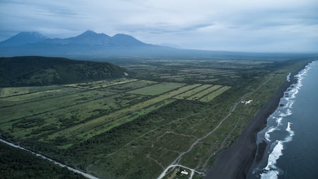 Aerial view of Khalaktyrsky Beach. A serene coastal landscape with a stunning black sand beach and majestic mountains