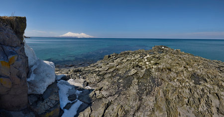volcanic coast of Pacific ocean in Avacha bay on spring day near Petropavlovsk-Kamchatsky city, Kamchatka Krai, Russia