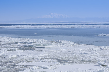 Russia. The Far East. Spring view of the ice of Tikhaya Bay on the Pacific coast of Sakhalin Island.