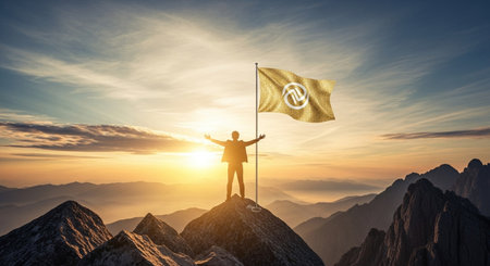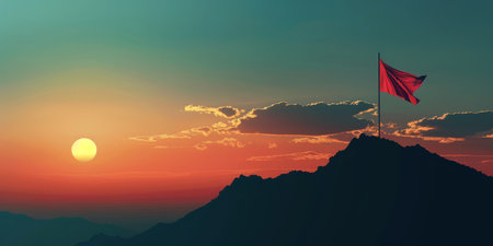 Triumphant flag atop steep mountain at sunrise symbolizes success after overcoming challenges