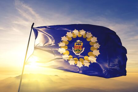 Oshawa of Ontario of Canada flag textile cloth fabric waving on the top sunrise mist fog