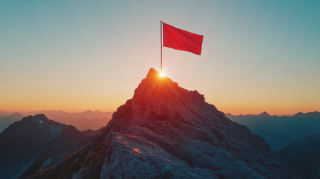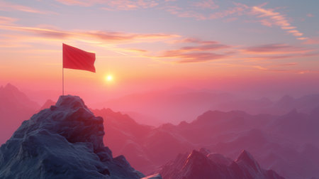A striking image of a red flag proudly displayed on a rocky mountain peak during sunrise. The vibrant colors and serene landscape evoke a sense of adventure and achievement in nature.