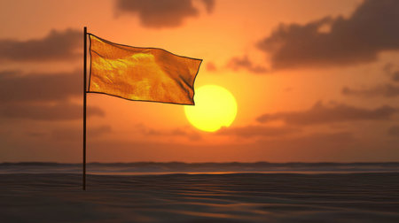 A golden flag gently waves in the breeze during a stunning sunset, casting a beautiful reflection on calm ocean waters, creating a serene atmosphere.