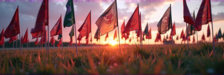 That the image is generated using AI. Diverse flags at sunset in grassy field with warm lighting.