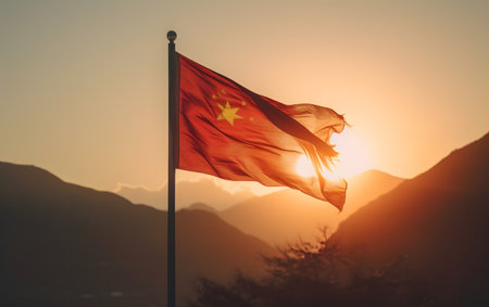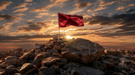 Vibrant red flag stands tall atop rocky mound, illuminated by warm glow of sunset. dramatic sky features clouds in various shades, creating striking backdrop