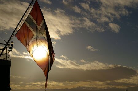 Worn flag displaying flame icon waves in the wind during a stunning sunset, creating a dramatic scene filled with rich colors and textures, symbolizing strength and hope