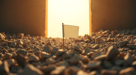 A blank flag on rocky terrain leads the eye toward a glowing doorway, symbolizing future opportunity and hope. Ideal for themes of aspiration and success.