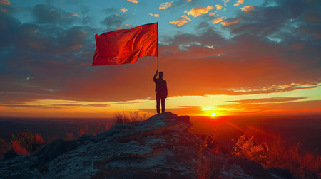The silhouette of a triumphant hiker stands on a mountain summit with his fist raised in victory next to a tattered red flag. The breathtaking sunset over the mountains in the background creates a powerful, inspirational scene of success, achievement, and conquering challenges.
