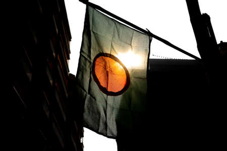 The national flag of Bangladesh is flying in the sky. The flag of Bangladesh is made of a center red circle in green. Close Up View of the national flag of Bangladesh made of Silk fabric.