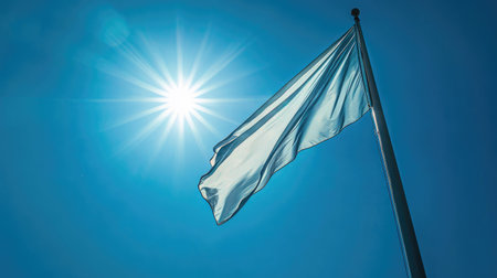 Close-up of a flagpole with the flag unfurled, blowing gently in the wind under a clear sky, with the sun shining brightly in the background.
