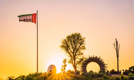 Flag of UAE or the United Arab Emirates on a flagpole flying high or waving at Love lake Al Qudra Desert Dubai. Suitable for National Day Celebration.