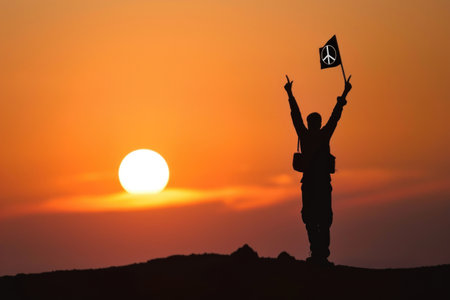 Silhouette of a man holding a pacifist flag, with the sun in the background. Concept of peace.