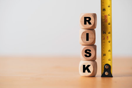 Risk wording print screen to wooden block cubes with yellow tape measurement on table for risk analysis assessment and management concept.