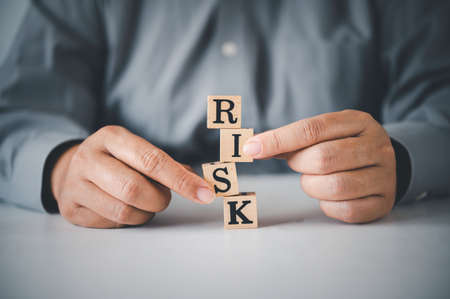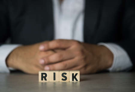 Wooden cubes with risk word placed in front of businessman in suit. Risk management concept. Strategy and successful intervention concept for business.