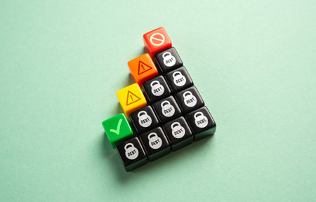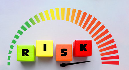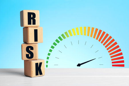 Scale with arrow indicating level of risk and wooden cubes against beige background