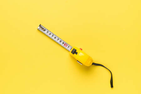 Yellow measuring tape stretched diagonally on a yellow background. Minimal concept of measuring instruments. flat lay.