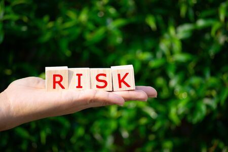 Hand hold wooden block with the word RISK. Concept risk
