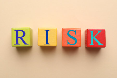 Risk word made of wooden cubes on beige background, top view