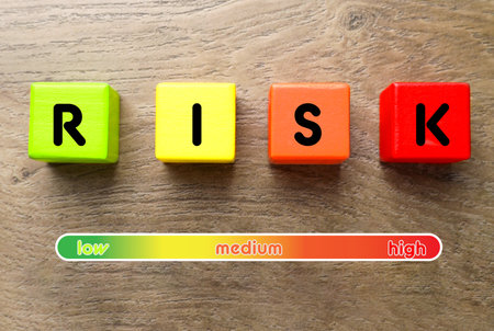 Risk assessment, decision to accept business result in uncertainty, unpredictable situation concept, cube wooden block with alphabet building the word RISK.