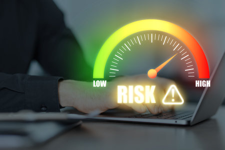 A digital illustration featuring a magnifying glass focused on a circular risk gauge.