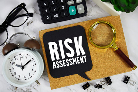 Risk Assessment text with Calculator, alarm clock and magnifying glass on marble background