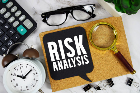 Risk Analysis text with Calculator, alarm clock and magnifying glass on marble background
