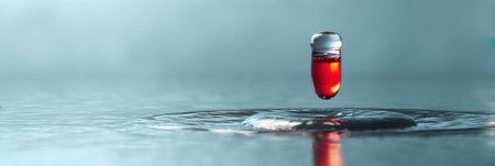 A vivid droplet of red medicine hovers in the air, reflecting light as it prepares to land on a calm surface of clear water with gentle ripples.