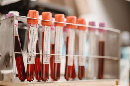 Blood samples for analysis of infected blood samples in a laboratory. Coronavirus test.