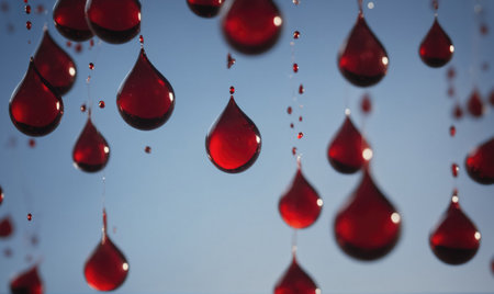 Red drops of liquid fall against a blue background