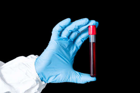 Hand holds a test tube containing a blood negative sample, test tube with blood for Covid-19 (coronavirus) analyzing. Laboratory testing patient's blood. Blue nitrile glove.
