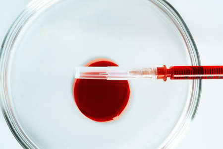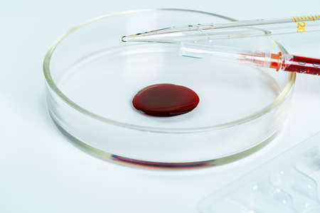Medical laboratory. A hand in a medical glove pours blood into a petri dish for analysis. Laboratory tests