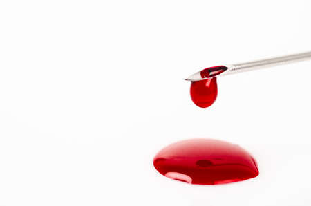 Macro view of drop of blood from needle syringe over white background.
