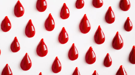 Vivid red blood droplets form a striking pattern against a clean white background, evoking emotion and artistry.
