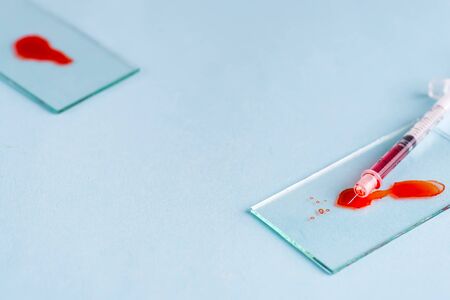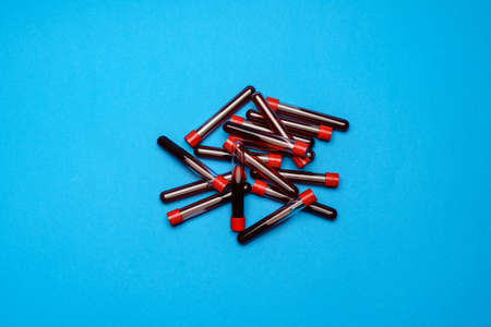 Blood in test tubes on blue background. Top view