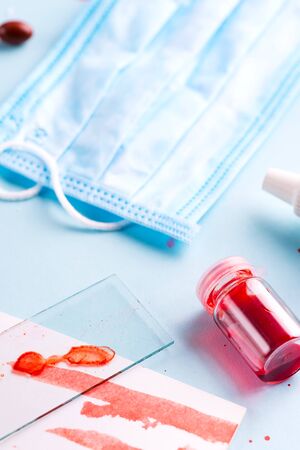 Medical set for blood test with glass small bottle of red blood or liquid and disposable protected mask on a light blue background, copy space. Coronavirus pandemic concept.